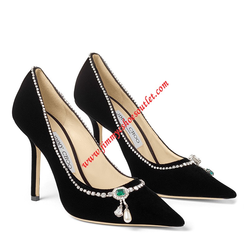 Jimmy Choo Love 100 Velvet Point-Toe Pumps With Crystal Mix Necklace Detail Black