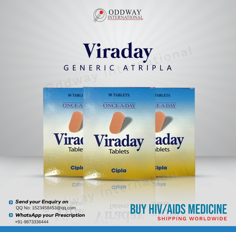 Viraday tablets contains Efavirenz/Emtricitabine/Tenofovir Disoproxil Fumarate is used to treat HIV, the virus that can cause acquired immunodeficiency syndrome (AIDS). It is manufactured by Cipla Limited in a pack of 30 tablets. Customer can avail bulk viraday at lowest price from Viraday wholesale supplier. We are leading pharmaceutical exporter, supplier, wholesaler and distributor of generic HIV drugs.Our products include treatments for diseases such as HIV/AIDS, Cancer, Liver Diseases, Cardiovascular Conditions, Respiratory and Inflammatory Diseases among others. Contact us by call +91-9873336444 or E-mail sales@oddwayinternational.com to get more information.