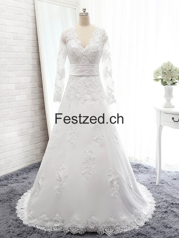 A-Linie V-Ausschnitt Lang-Ärmel Weiß Spitze Brautkleider – Festzed.CH