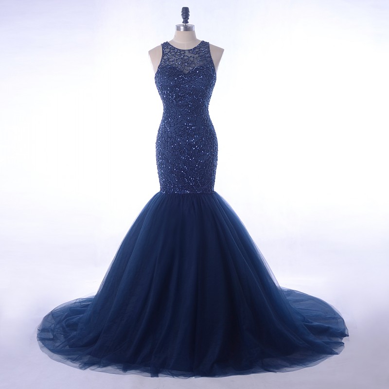 Elegant Navy Blue Rhinestone Beading Top Tulle Mermaid Evening Prom Dress 2018 [PS1708] – $218.99 :