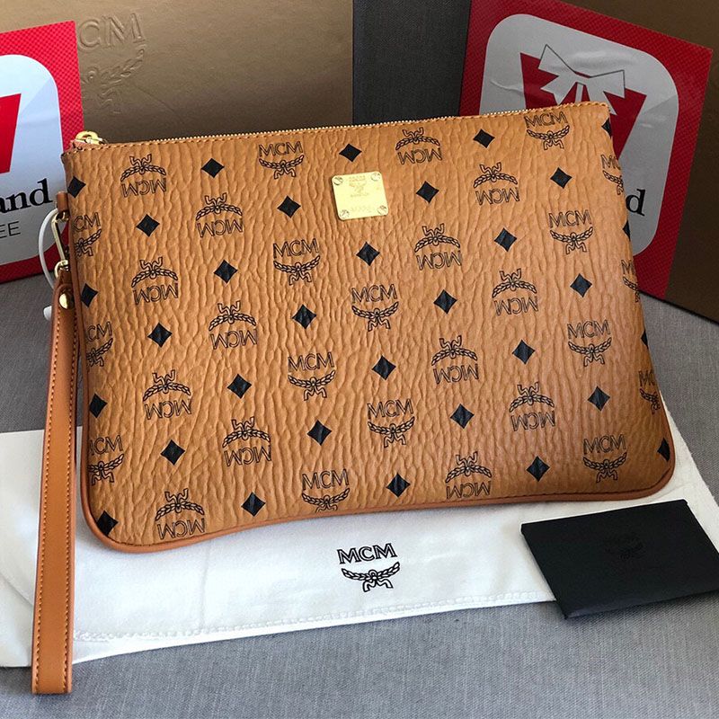 MCM Medium Wristlet Zip Pouch In Visetos Original Brown