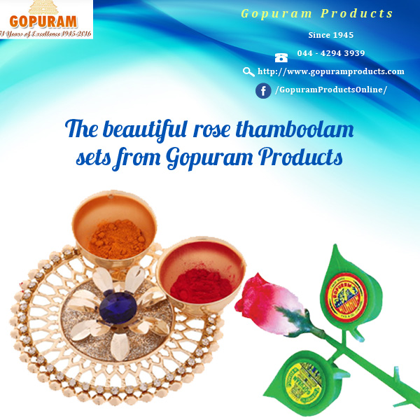 We manufacture different varieties of Thamboolam bags , quality Kumkum, you can order all online.Pure pooja oil is now available online at Gopuram Products, who also manufacture various other pooja products as well.